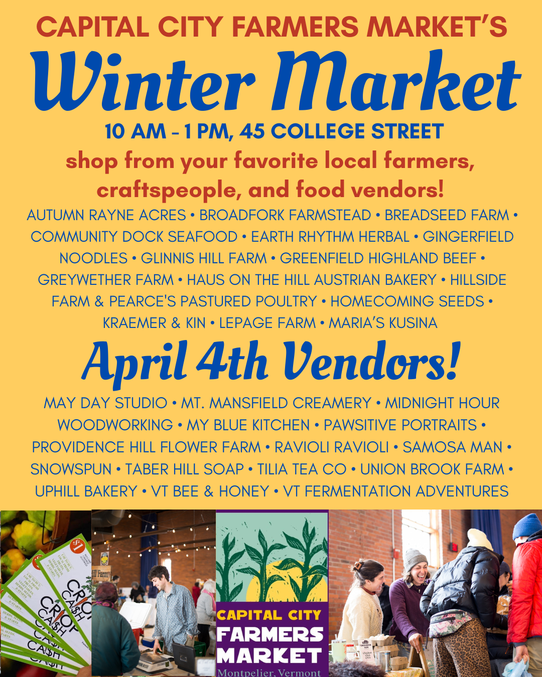 Support your Favorite Farmers, Craftspeople, and Food Vendors at Capital City Farmers Market's Winter Market, 10am-1pm, every 1st and 3rd Saturday, December-April at Alumni Hall at 45 College Street.